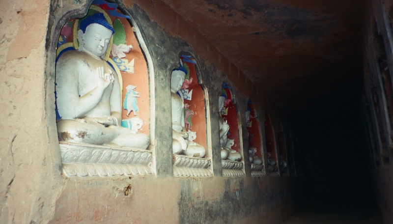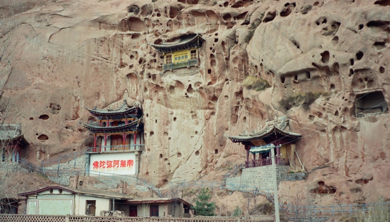 馬蹄寺石窟は祁連山の麓に作られた石窟群で、内部をアリの巣のようにくり抜き、元から明代にかけて作成された壁画が残っている。時間が遅かったので、観光者は私一人だった。石窟の中は薄暗く、物取りに襲われないか、気味悪さを感じた。